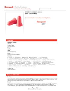 Honeywell 3301161 Howard Leight MAX Foam Earplugs Data Sheet
