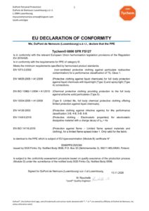Home / Workwear / Limited Life / DuPont Tychem 6000 SFR Hooded Coveralls / DuPont™ Tychem® 6000 SFR Hooded Coveralls Declaration of Conformity