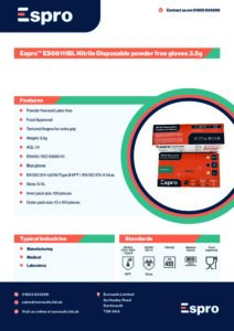 Home / Hand / Disposable / Espro ES66111BL Nitrile Disposable Powder Free Gloves – Box of 100 / Espro ES66111BL Nitrile Disposable Powder Free Gloves Data Sheet