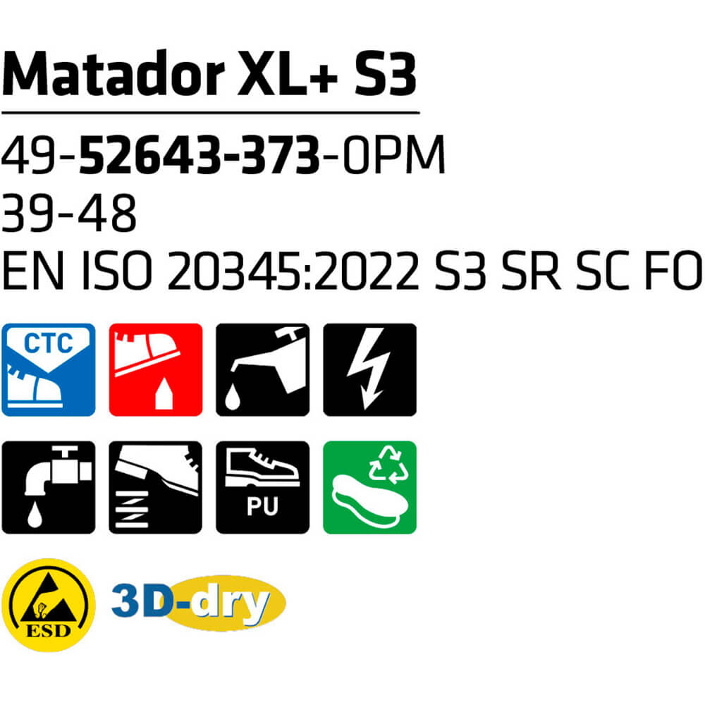 Sievi Matador XL+ Safety Shoes are premium quality, high specification work footwear. High quality, S3-rated safety shoes with a professional look and wide fit for added comfort. Suitable for use in a range of working roles, for example construction, logistics, stock management and more. Tested and certified to EN ISO 20345:2011 & EN ISO 20347:2012 European safety standards.
