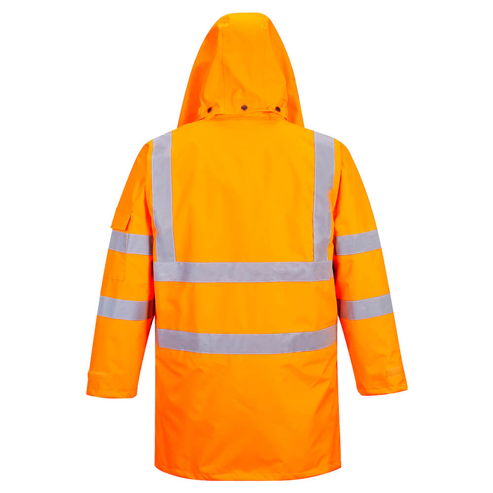 Portwest RT27 High Visibility 7-in-1 Traffic Jacket is an innovative, multifunctional work jacket. Warm, waterproof, comfortable and breathable, this versatile jacket features a detachable hood, detachable sleeves and interactive inner jacket. This allows the jacket to be worn in seven different combinations, so it can be adapted to a wide range of weather conditions. Certified to the Railway Industry Standard RIS 3279-TOM, this jacket meets the stringent safety requirements the standard requires. Tested and certified to BS EN ISO 20471:2013+A1:2016 (Class 3), EN 342:2017 and EN 343:2019 safety standards.
